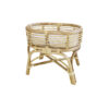 De rieten poppenwagen heeft een ronde kap en rotan duwer.