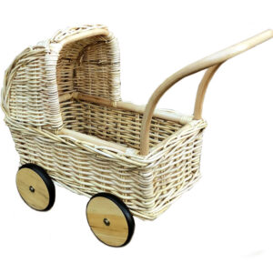 De rieten poppenwagen heeft een ronde kap en rotan duwer.